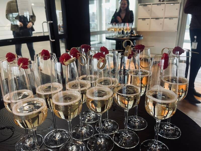 We ontvangen de personeelsleden feestelijk met gepersonaliseerde champagne flessen met uw logo en zorgen ervoor dat ze de gehele borrel niet met lege handen zitten. We serveren heerlijke hapjes en kunnen zelfs sabrage workshops organiseren.